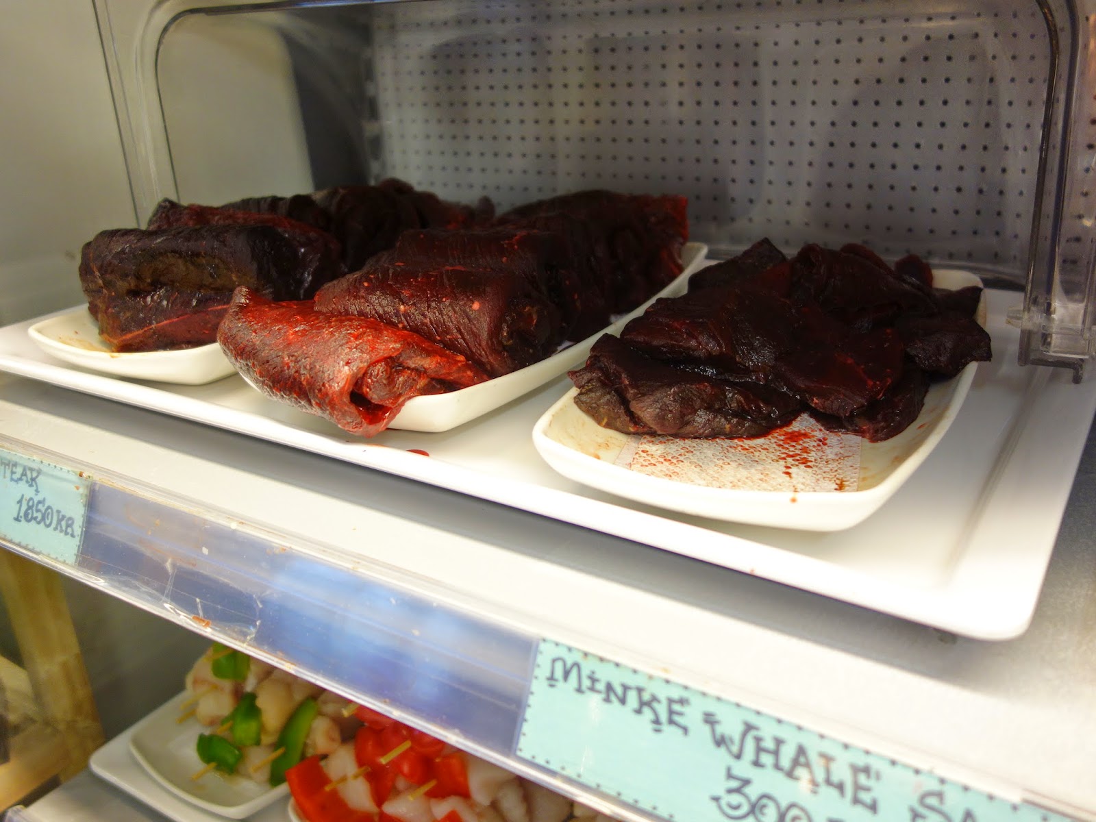 另外,這裡還有賣鯨魚肉。網路上有看到鯨魚肉串燒,不過我們今天沒有看到。反兒是一大片一大片的鯨魚排&切成一小塊狀的sampler. 雖然說食用鯨魚在冰島是合法的,但是我們總是有點覺得罪惡。因為我和RCS都是很喜愛嘗試新東西的人,所以之前一直討論要不要吃。絕管到是RCS先決定並且很堅定的和我說他不要吃。之前看捕鯨的紀錄片他覺得太殘忍又悲傷了,所以他不要吃。我有是因為這樣也決定不要吃。