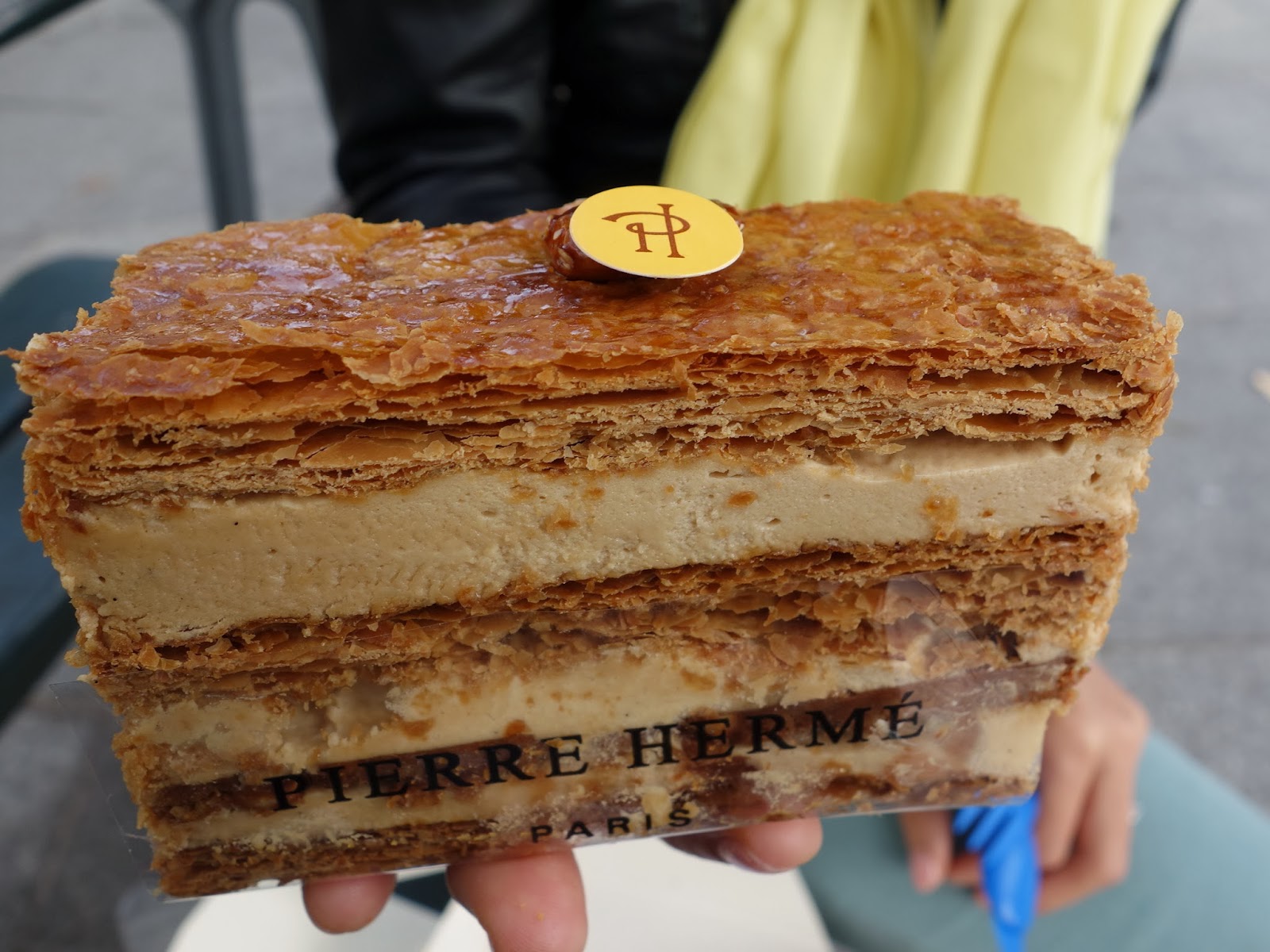 2000 Feuilles: 焦糖酥皮千層搭配上下層不一樣的榛果與堅果 cream。相當不錯,比Hugo et Victor 買的焦糖千層好太多了。不過缺點是很難動手吃,有點太高了。