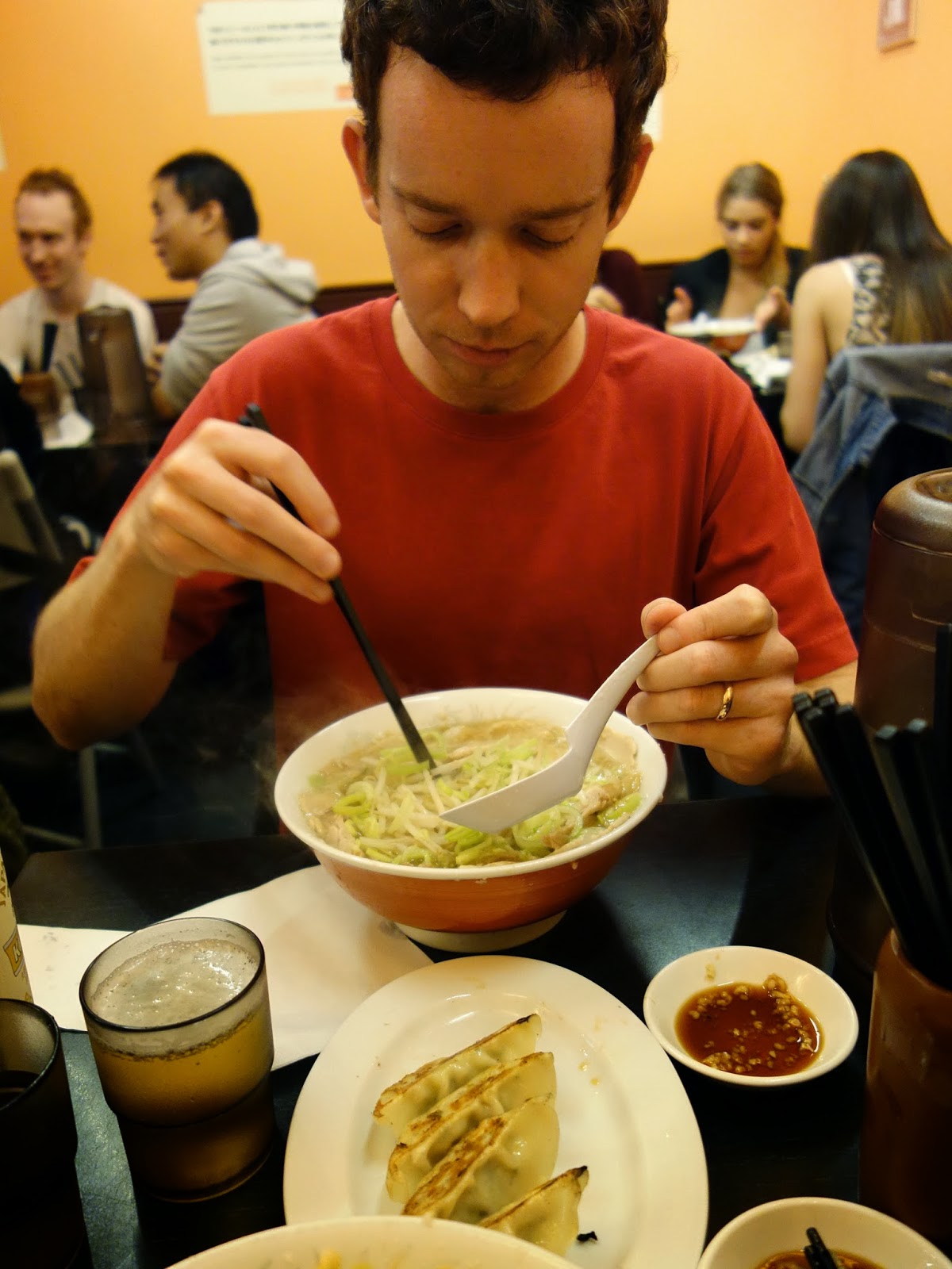 老實說我們在這裡附近晃這麼久,就是要去吃在我們公寓附近的日本拉麵!開店前半小時經過還沒有人排,所以我們就想說等一下下再回來。結果開店前十分鐘我們一道,已經排了大約十五個人了吧!所以我們趕緊加入隊伍。裡面位子不多,所以我們很深怕無法當第一波客人。(這樣就要再等很久耶,要等第一波的人吃完才輪的到我們。)