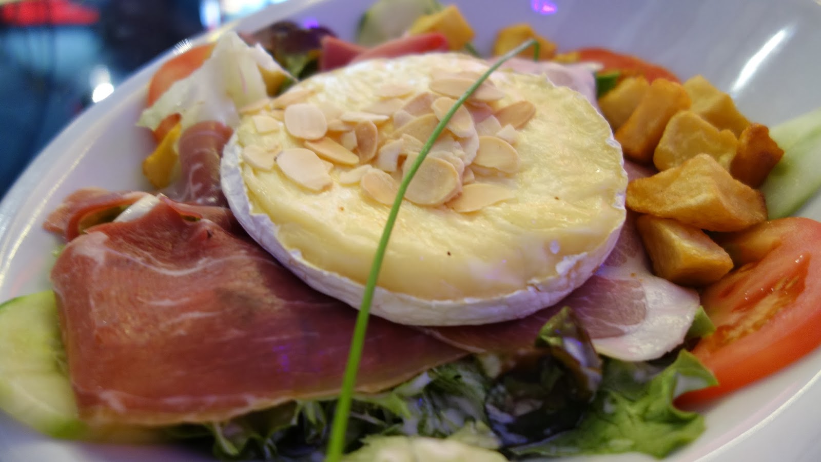 這道 “巴黎沙拉” 則是我們共同的愛。有我們愛的生火腿,一整片的camembert (極度好配酒)還有新鮮脆脆的蔬菜(呀比!新鮮蔬果在旅行中很可貴噢。),非常好吃。