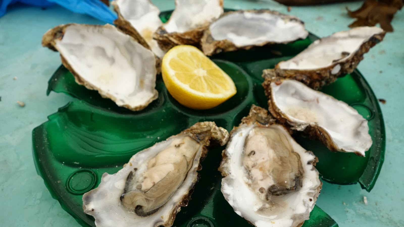 大叔轉向一位年輕男子翻譯了以後,年輕人基本上就和我們用英文單字溝通。他問我們喜歡什麼樣的生蠔,我們完全不知該如何回答。他應該也看出我們沒有頭緒,所以就說 “You like creamy?” 我就回說”YES!“ 然後就看他東抓西抓,量了量重量,跟我們收錢。八個只要八歐元左右!極度有夠便宜!(早知道就吃二十顆。)