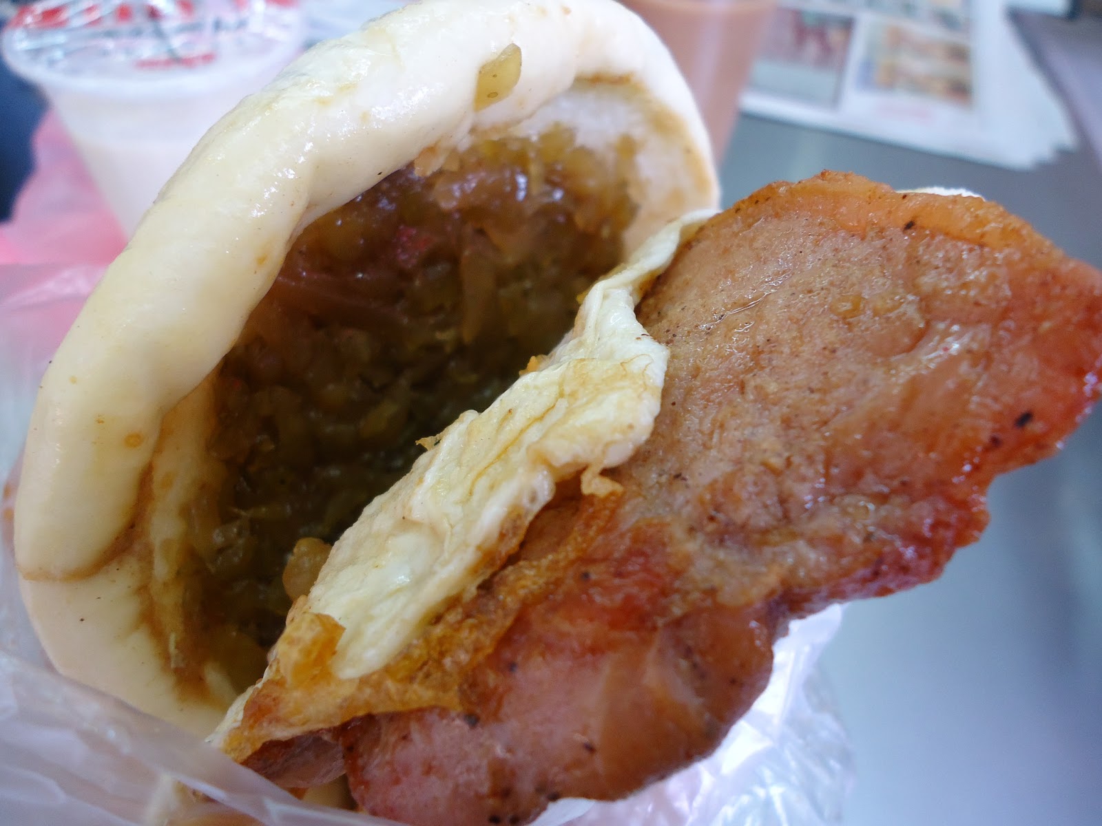 熱愛中式早點的我眼尖發現一家,立馬帶著美國人入座。本來要點常吃的飯糰燒餅等等,結果被我發現早餐割包。馬上改點兩份割包夾蛋。裡面的肉不是控肉,比較瘦,感覺早上吃也不會太油膩。