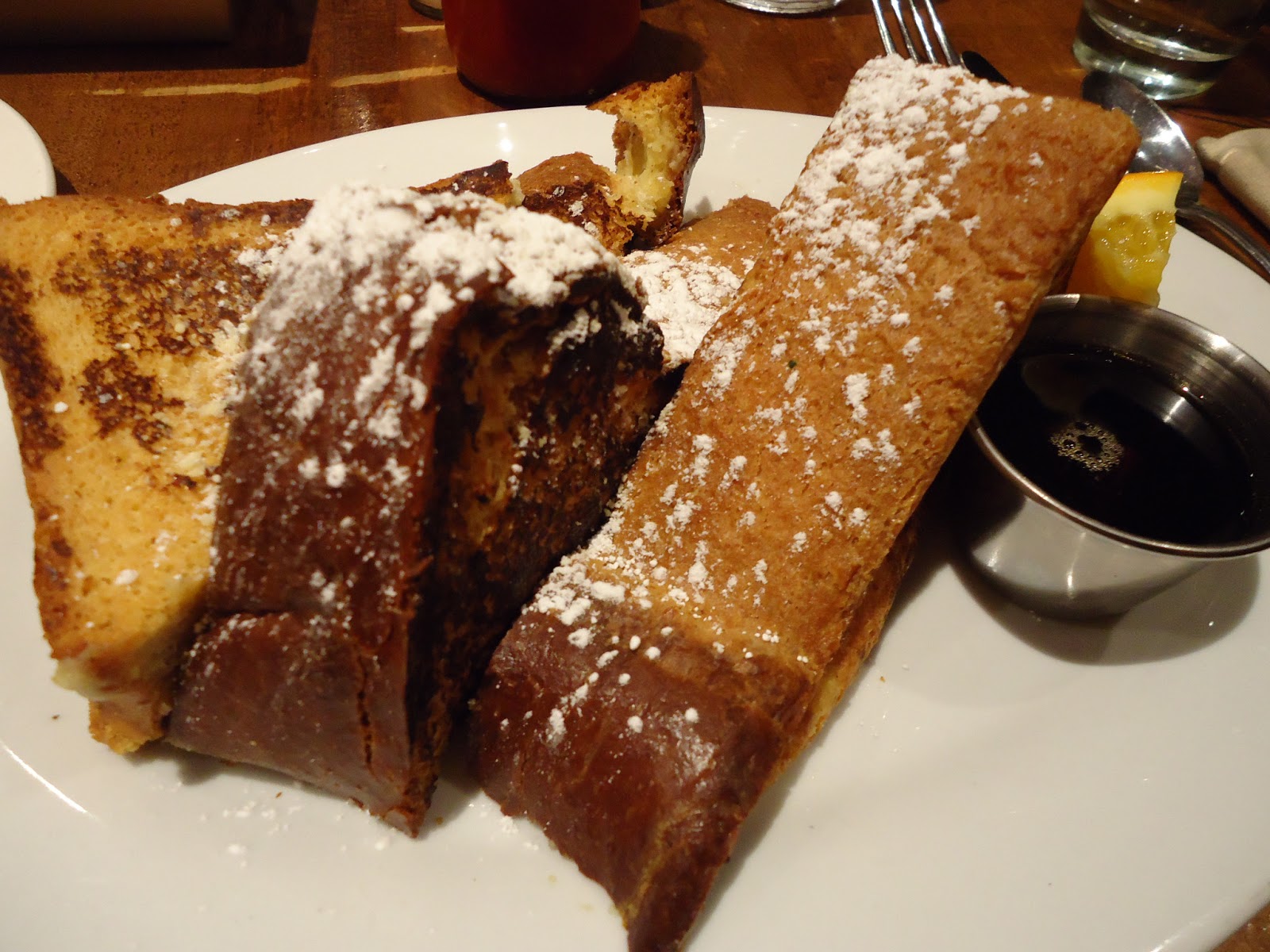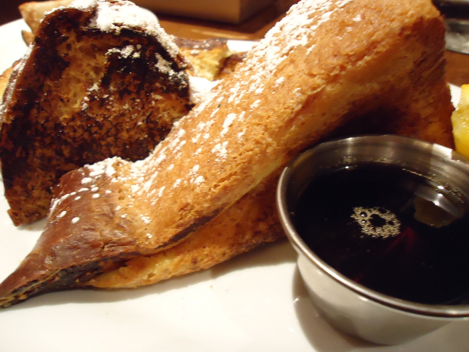 搭配楓糖漿也相當對味。不過甜味大大上升。 基本上不沾糖漿也很夠味。土司邊邊竟然脆脆,土司本身吸滿了香草蛋黃液,又香又軟。我打甲上星!不會過甜這點很可取!
