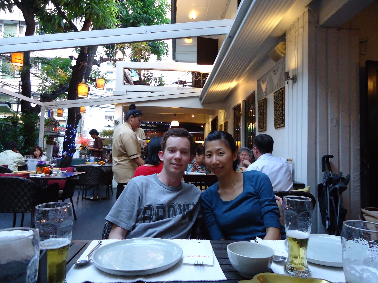 到達時間大約五點半吧。決定去書上介紹到的 Mango Tree 餐廳吃晚餐。 下站之後在莎拉當站週邊邊逛邊找餐廳,有很多攤子都在準備,晚點出來可以夜市。不過我們決定先吃。這家離地鐵站不遠,但是有點難找,因為要在巷子裡彎來彎去。不過我覺得小巷子沒有標英文&攤販遮蓋視線真的有讓它更難找。不過我們還是達成了,因為沒有訂位,所以被安排在室外庭院。其實不會很熱,但好像有一點蚊子,不過我們有都沒有被咬就是了。不過鼻子最靈的N爸說他一直聞到馬路水溝的味道,不過我到是覺得還好。反正上菜後應該就會分心了。