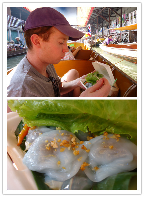 話說我對水上市場最期待的就是吃小吃了,完全不想買紀念品。而且大家看到我們有RCSIII這隻白泡泡的大肥羊(雖然他是最不愛買東西的)都開天價。昨天以 100 Baht 買到的純泰國絲圍巾這裡竟然給我開 650 Baht。當然不買。
