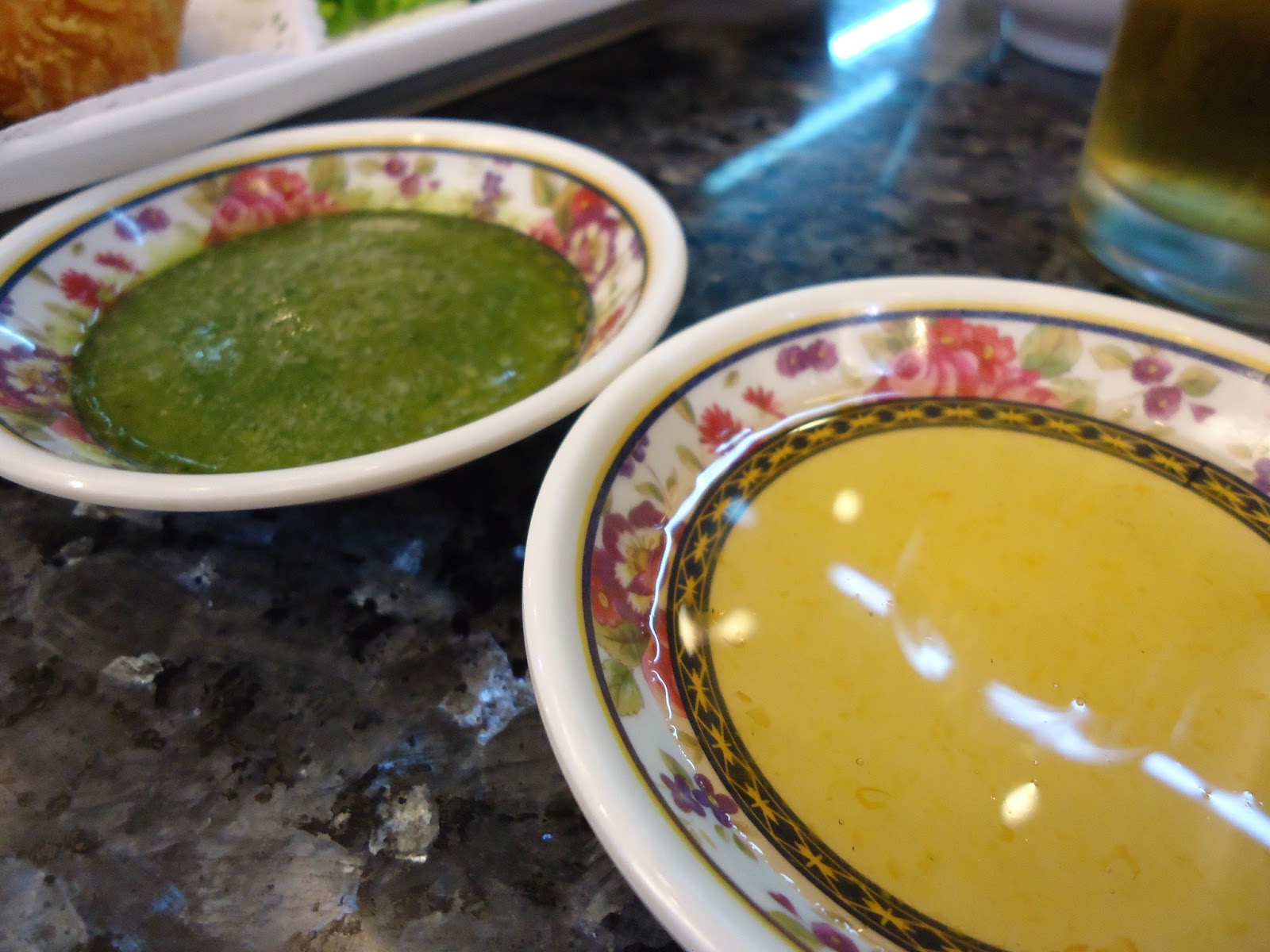 左邊綠色的偏辣,右邊黃色的偏甜。所以我幾乎所有的東西都搭配這綠色的醬。