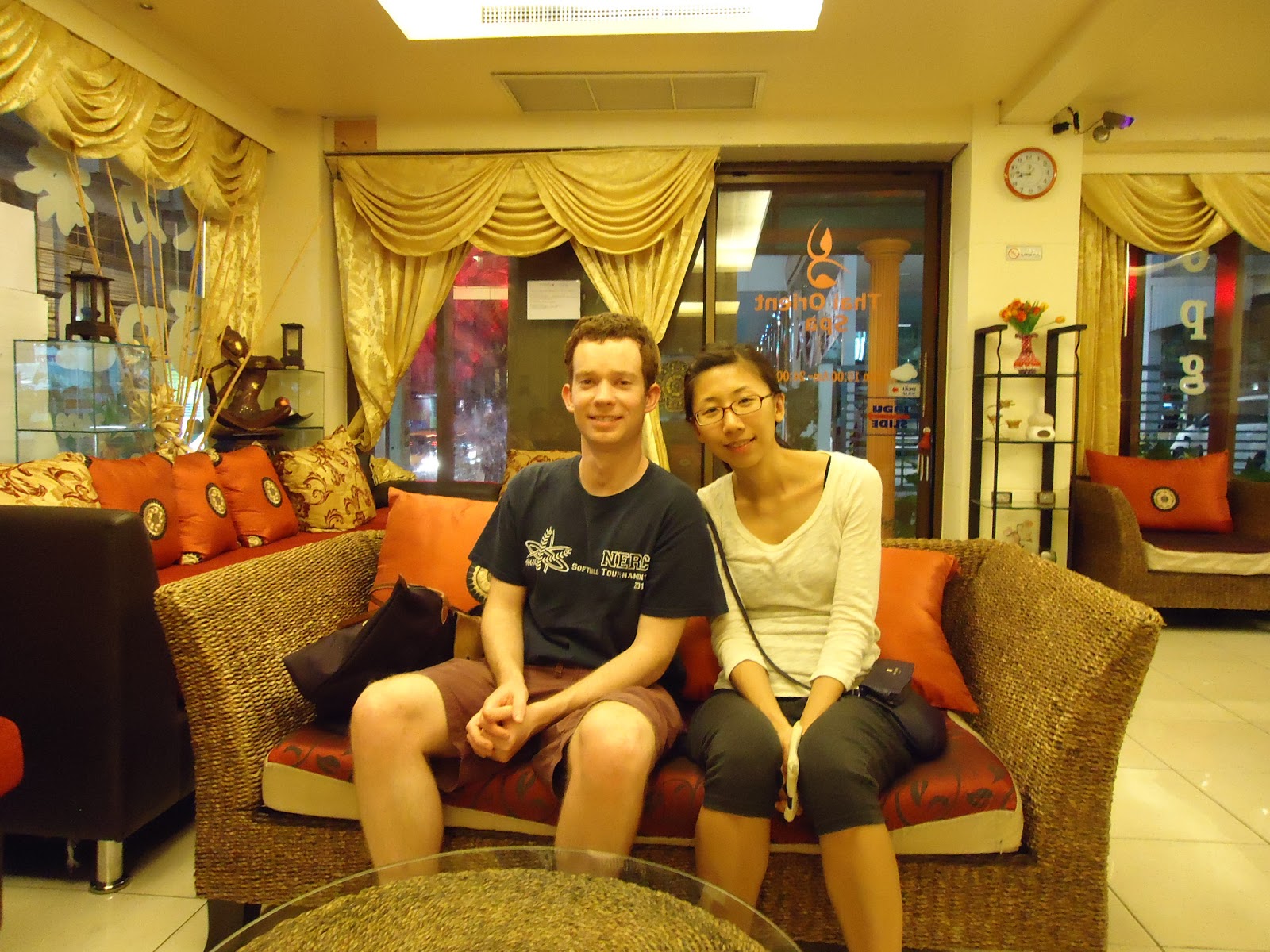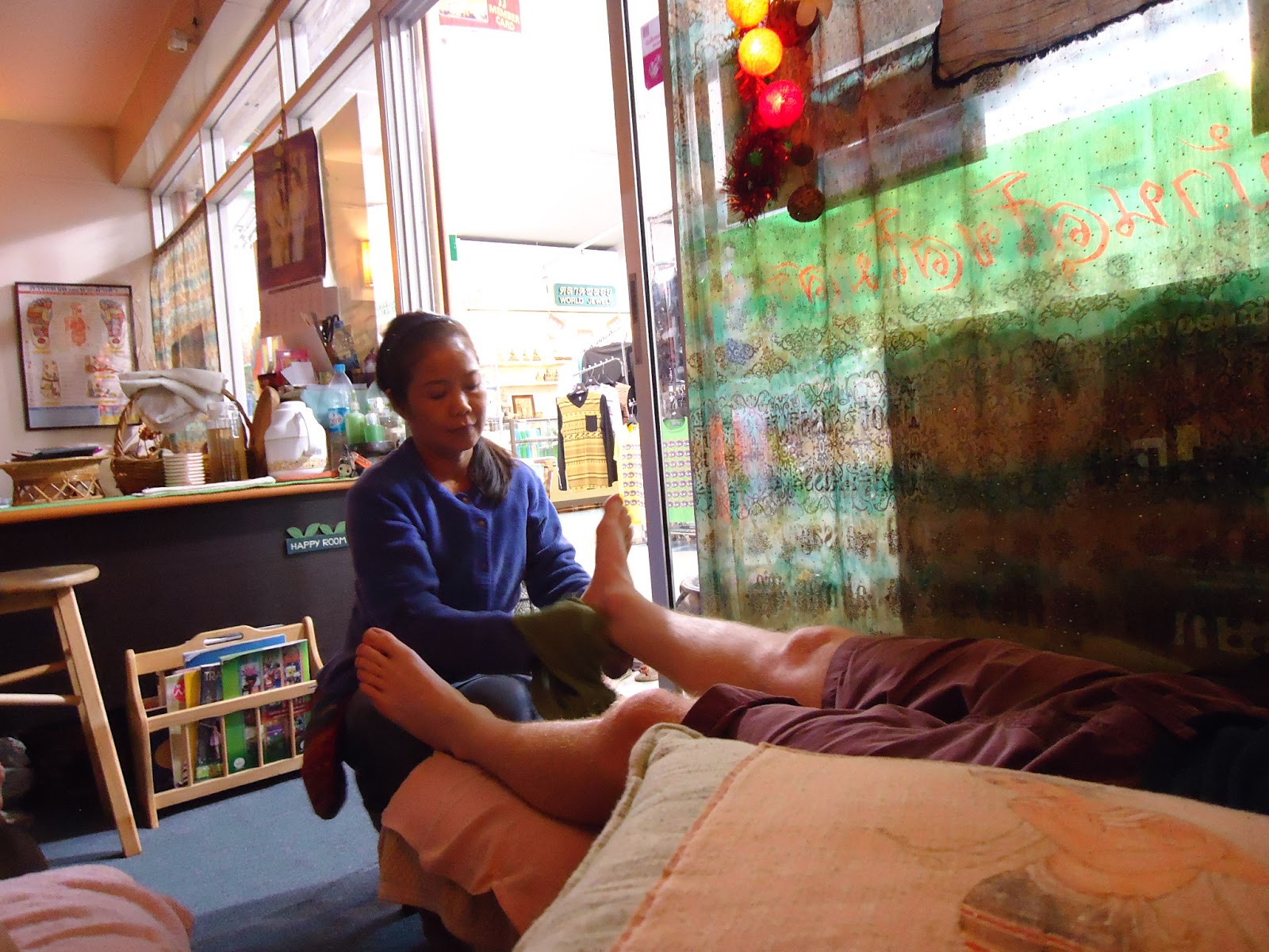 我們洗完腳換完鞋後被帶去二樓換衣服,最後四人被帶到同一間房間去按摩。共有四位按摩師。在洗腳的時候按摩師們一直看著RCSIII笑還一直叫他Baby,似乎是認為他年紀很小。就定位候我們先躺下面朝下的開始被按,之後在轉面朝上被按。最後按摩師會先出去端一杯熱茶和糖果進來,並做最後一部分的頭背部按摩。