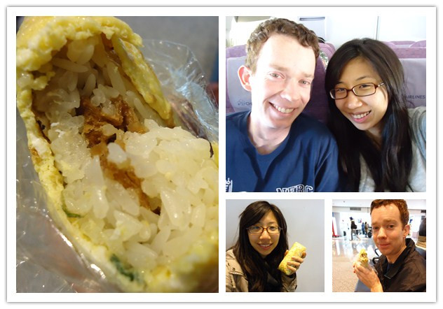 因為是一大早的班機,所以天還沒亮我們就開車前往桃園中正機場。由於外國人RCSIII是我們裡面唯一沒有摩爾貴賓室 Priority Pass的人,所以我也只好下海陪他在航廈裡逛。因為信用卡有停車及機場接送的服務,所以我們直接把車開倒機場外與信用卡公司的合作停車場內。沒想到下高速公路到車場之間滿滿都是早餐店!好心的N爸N媽讓我們找了家傳統中式早餐店點了我好愛吃的飯團夾蛋和清漿等等食用。話說這比貴賓室的一切都好吃耶。
