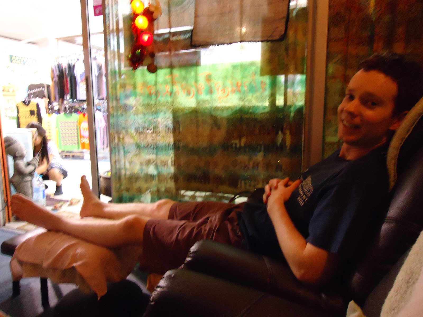 因為沒有打算買什麼紀念品,所以慢慢得有點無聊,加上因為很早就出門,所以大家都有點累了,因此熱愛按摩的我和媽媽就想說來做腳底按摩好了。在JJ Mall 裡有看到幾間,稍為比較一下 foot massage 的價錢,發現一般價是 250/HR,有發現一家是 200/HR,但是按摩師不夠,空間又有點過於擁擠,所以我們是做 250/HR的。