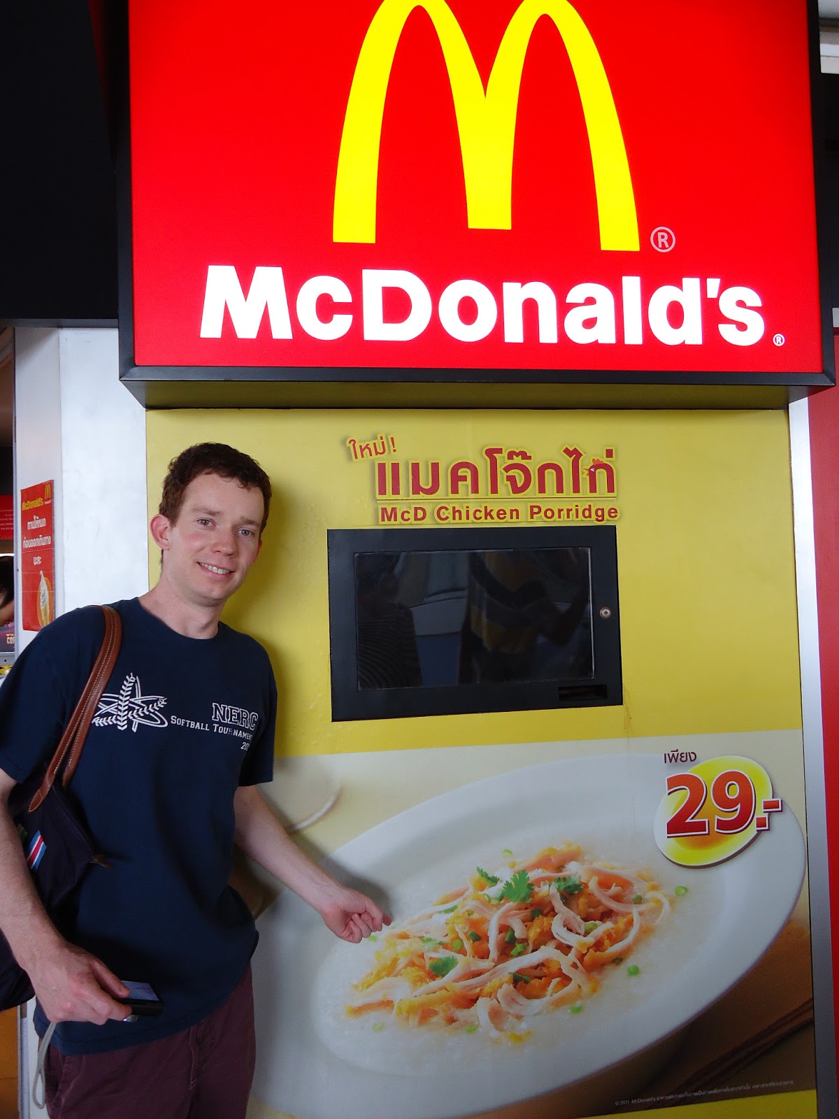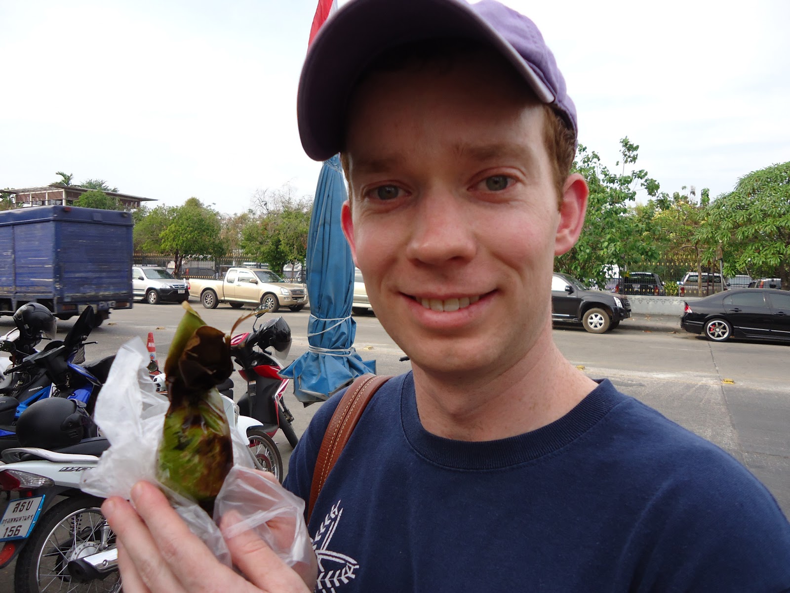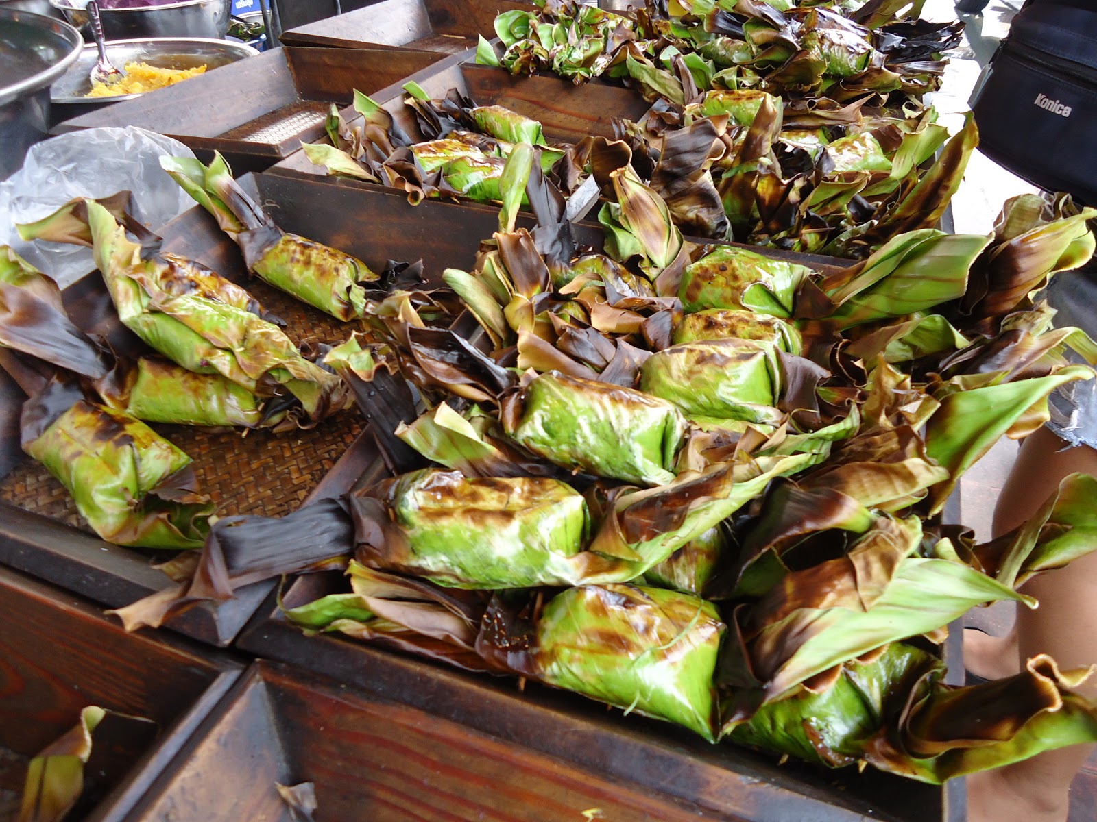 一個只要10 Baht,就是蒸熟的糯米裡面包抹餡料,我今天選的是Yam&Taro,就是前兩張圖片右邊紫紫紅紅的那一鍋。他們在蕉葉中抹油後包入糯米,放入餡料後再用竹籤固定好葉子,最後炭火加熱。剛烤好熱熱的小粽子讓我相當期待。 腸胃虛弱的美國人也下海!