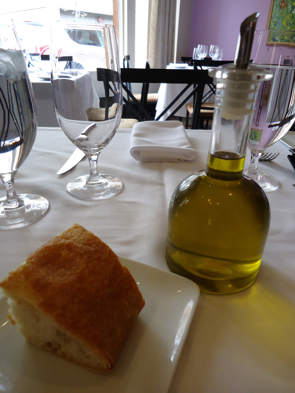 首先點完餐就會上EVOO & 麵包。話說麵包是由一位扛麵包籃的侍者一直遊走在餐廳裡夾到你的麵包盤上。理論上是可以一直續,但是你要是不特別說的話,大概就是前菜時給一次,主菜時再給一次。