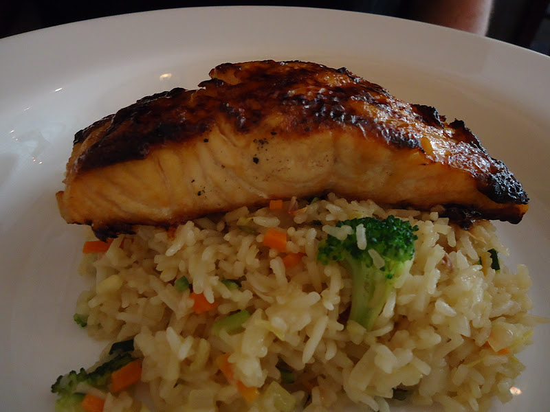 Then, the main courses were served. RCSIII ordered "Grilled Atlantic Salmon with a Honey, Miso Glaze" served over an Asian Vegetable Fried.