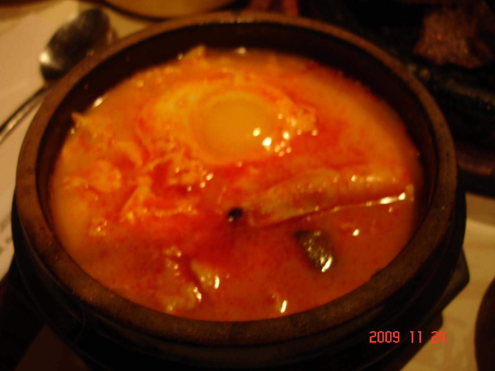 我點了海鮮豆腐鍋.豆腐超棒,有兩種口感混在一起.一種是極嫩的一種是略硬一咪咪然後有一些洞洞在豆腐體內.所以會吸湯汁!很棒!海鮮鍋調味很好,有很多小魷魚跟蝦子混在裡面,也有給一隻大蝦子.不過重點是豆腐!唯一有一點點美中不足的就是它的但是幫你打進去的,我比較喜歡自己加蛋的那一種.