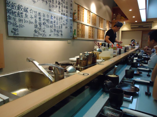 I've never had hibashi/tepenyaki dining experience in the US, but according to my friends, the chef just had to interact with the dinners. I am not sure I will enjoy that. However, when you go to such restaurant in Taiwan, you never have to worry about that. Chef only prepares your food and asked you about how do you like to done or any additional seasoning. Other than that, you can still talk to your friends.