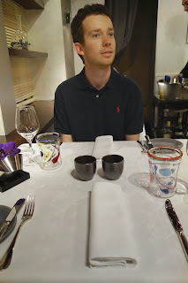 雖然說晚起,但是還是來得及準備準備去摘我們法國巴黎的第一顆米其林星星@ La Truffiè!話說巴黎今天又是下小雨,也是相當溼冷。不過兩人都沒吃早餐,所以相當期待這頓午餐。上面這張是請侍者照的,照完他自己在那邊說“完美完美”,但是一點都不完美啊。美國人吐舌頭的飢餓狀態完全被捕捉了。